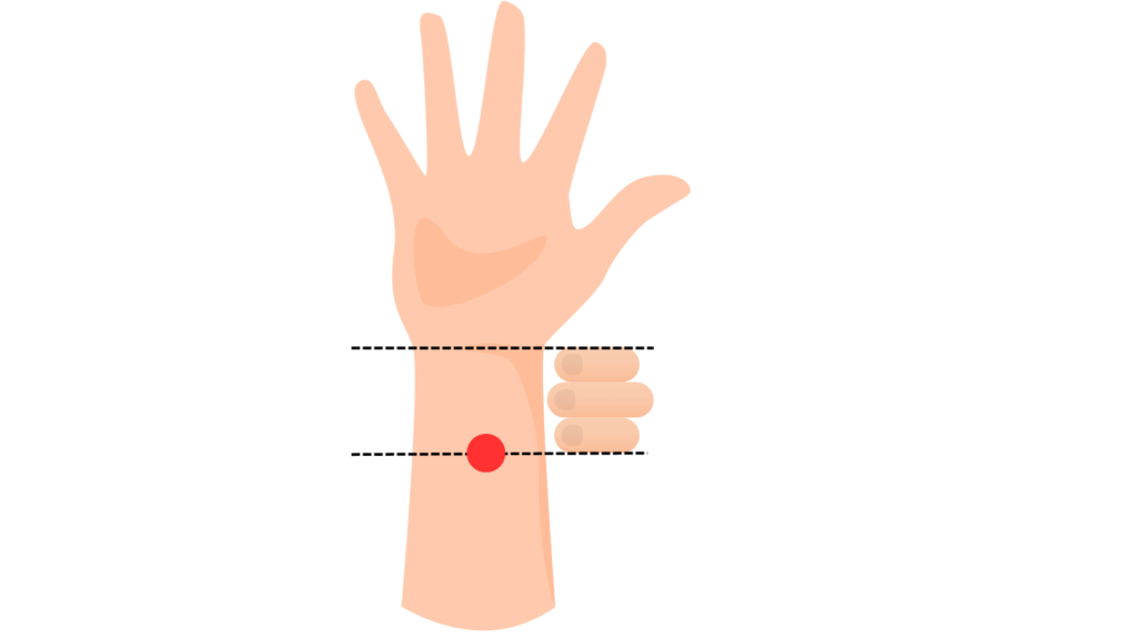 手のひら側の、手首のしわから3指幅分肘側にあります。